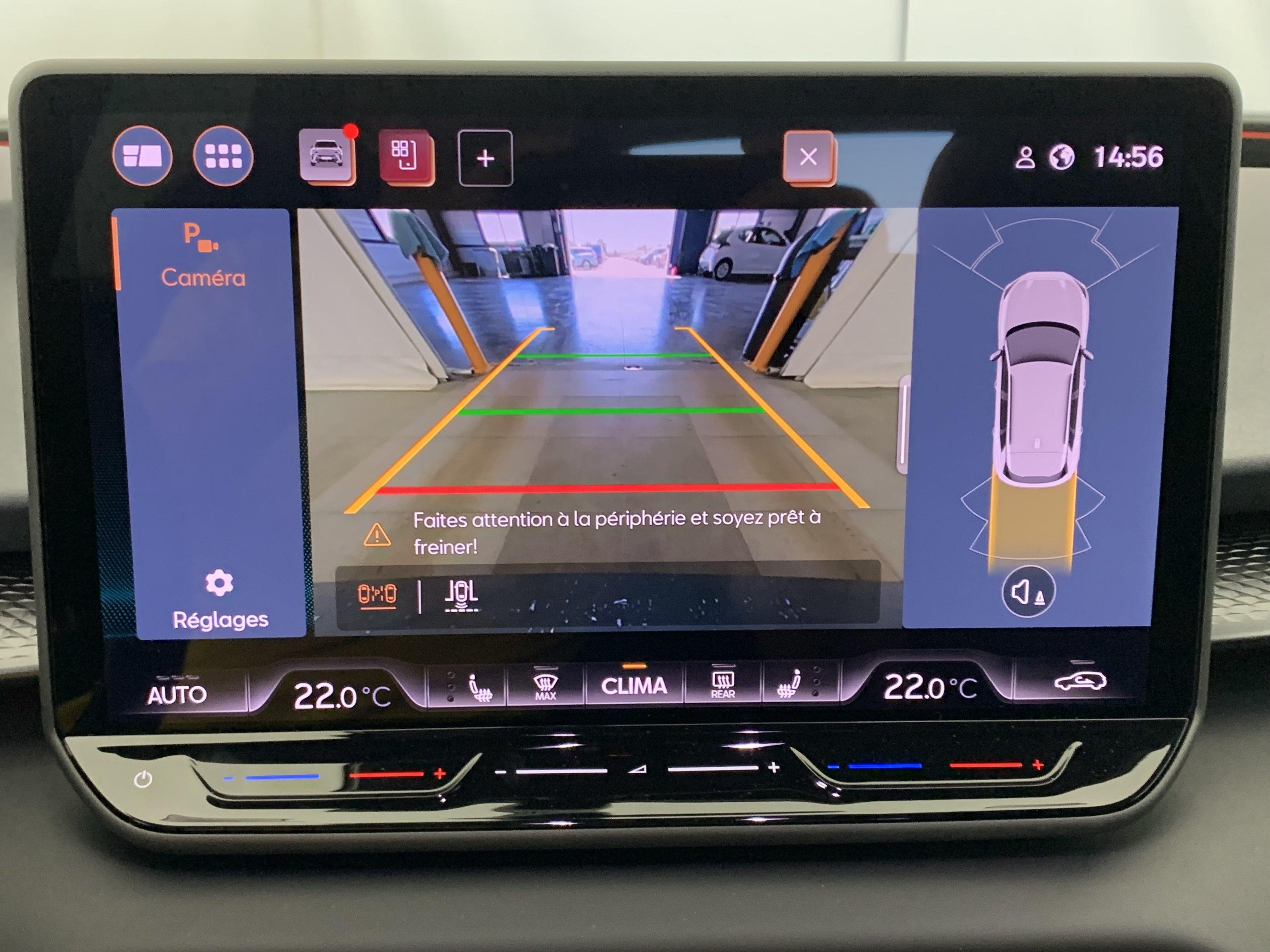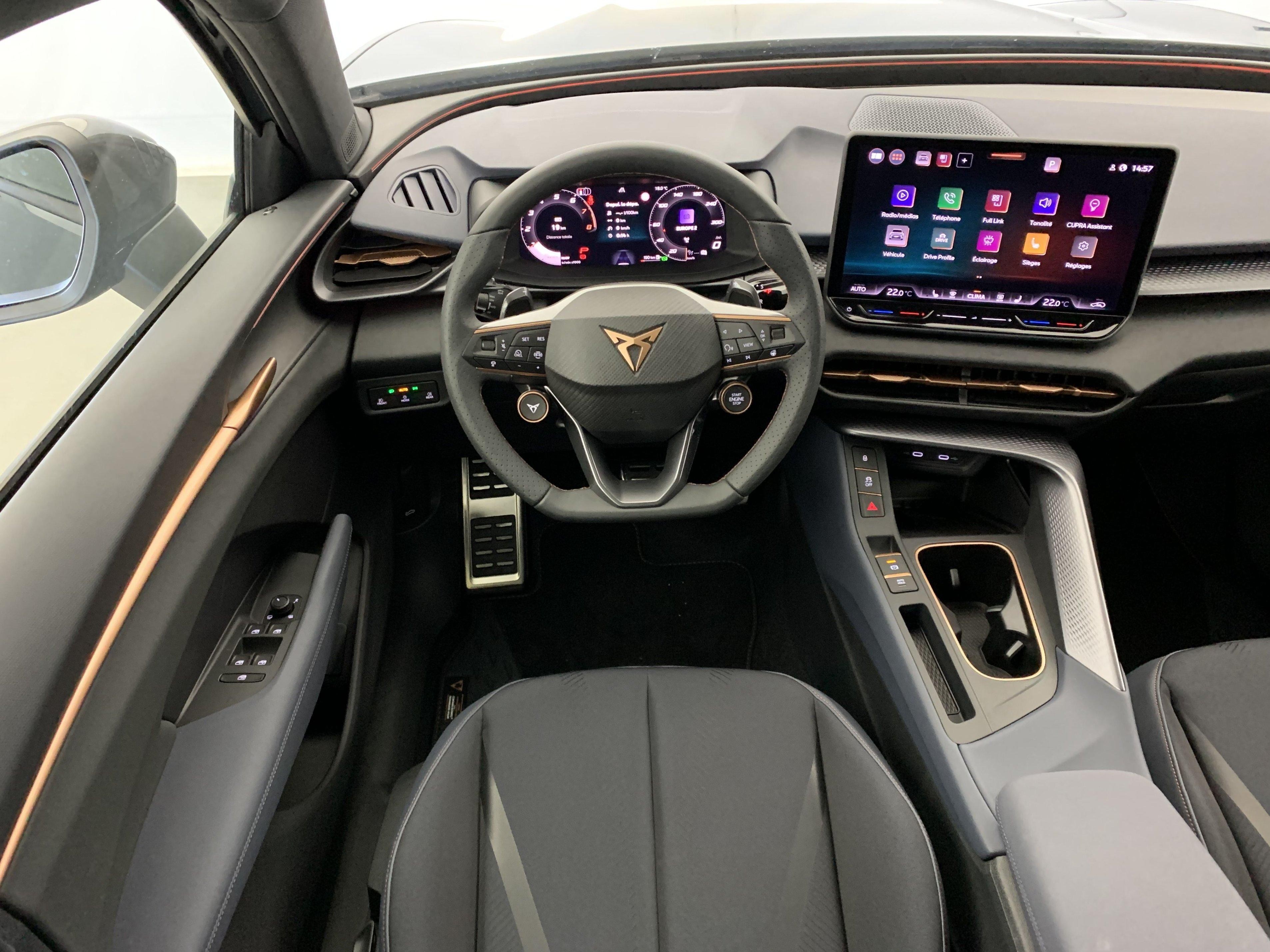 | Reconnaissance des panneaux de signalisation (Sign Assist) | Design Intérieur Deep Ocean (sièges baquets TEP + textile Bleu Acier) - Logos CUPRA estampés sur les appuie-têtes - Planche de bord bleu acier texturée avec aérateurs cuivrés - Contre-portes en TEP noir texturé - Ciel de pavillon noir - Sièges conducteur et passager avec réglage manuel en hauteur et lombaire |
